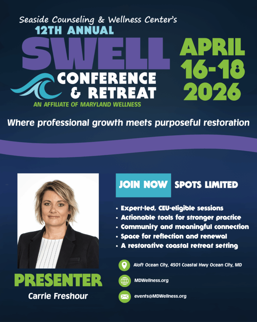 Hosted by Seaside Counseling & Wellness and Maryland Wellness, SWELL is where our region’s behavioral health community comes together to strengthen skills, spark ideas, and return home revitalized and better equipped to serve.